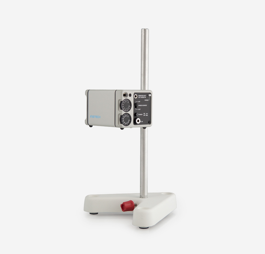 This is a convenient stand for mounting the Flow Control Pump (FC) near your vessel chamber. It contains a ring stand with a special adapter that attaches to the housing of the pump.